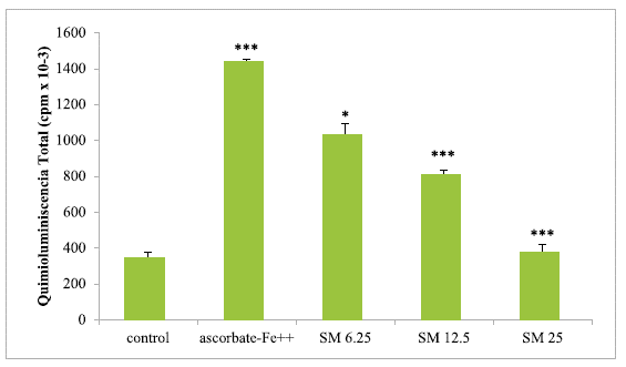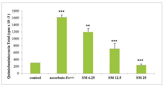 After incubation of mitochondria and microsomes in an ascorbate-Fe++ system(120 min at 37°C), it was observed that the percentage cpm/mg of protein from light emission (chemiluminescence) was lower in liver mitochondria and microsomes from chicken with the addition of SM. Thus, the highest percentage of inhibition of peroxidation observed with the addition of SM was 84.86% in mitochondria and 73.77% in microsomes for the dose of 25(µg of SM/mg of protein (figure 3).