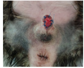 FIGURE 3: Feline patient in dorsal decubitus. Circular resection of the foreskin and pattern of simple interrupted suture between the mucosa and the skin.