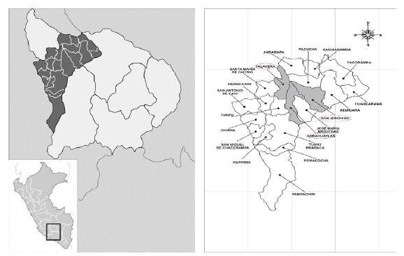 In Andahuaylas, the cattle population is divided as follows: 73.608 bovines, 124.589 ovines, 50.786 porcine, 14.914 alpacas, which corresponds to 25.3% bovine, 24.8% ovine 56.3% porcine, and 6.6% alpacas of the complete population of this region (INEI 2012). The studied zone is shown in figure 1.