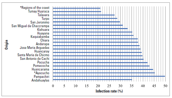 During this period, the general frequency of the disease was 46%, which classifies the province ofAndahuaylas as a mesoendemic zone of infection (10%-50%), according to the recommended ranking (Valderrama, 2016). This level ofprevalence, even though in a lower percentage, was like the values reported in the province of Aymaraes (24.6%) as well as in other spots of the country (Valderrama 2016). However, it is lower than what was reported in the province ofAbancay, where hyper-endemic levels of infection (51.3%) were reported (Carrión-Ascarza et al. 2021).