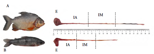 FIGURA 1: A. Anatomía digestiva y estimación del pH estomacal de P brachypomus. B. Anatomía digestiva y estimación del pH estomacal de S. fasciatus. E: estómago, IA: intestino anterior, IM: intestino medio.