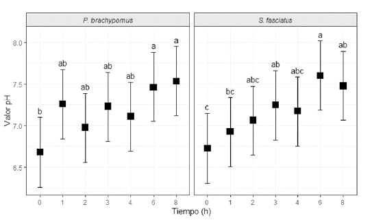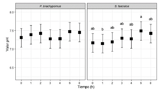 FIGURA 3: Valores de pH del intestino anterior de P. brachypomus y S. fasciatus durante el proceso digestivo (ocho horas). Letras distintas indican diferencias significativas entre horas de digestión en el intestino anterior para cada especie (p < 0,05). Ausencia de letras indica que no existe diferencia significativa.