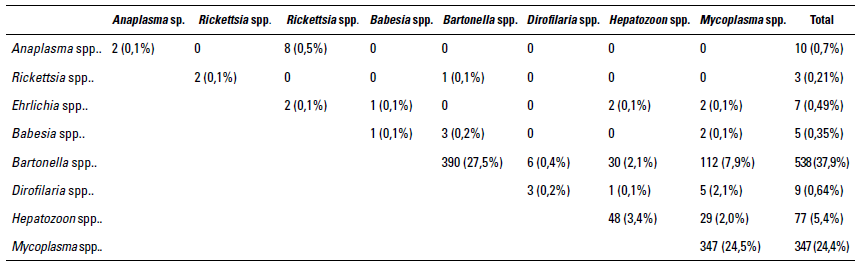 Al evaluar las bases de datos de felinos positivos mediante diagnóstico molecular qPCR en Medellín (Colombia), para uno o más microorganismos hemotrópicos se evidenció una frecuencia del 70% (996/1.418). El número de animales infectados con uno, dos o tres agentes fue del 56% (795/1.418), 14% (202/1.418), y 2,3% (33/1.418), respectivamente (tabla 1). A su vez, la frecuencia evidenciada para cada uno de los agentes, de menor a mayor presencia: Rickettsia spp. 0,21% (3/1.418), Babesia spp. 0,35% (5/1.418), Ehrlichia spp. 0,49% (7/1.418), Dirolifaria spp. 0,64% (9/1.418), Anaplasma spp. 0,7% (10/1.418), Hepatozoon spp. 5,4% (77/1.418), Mycoplasma spp. 24,4% (347/1.418) y Bartonella spp. 37,9% (538/1.418). Las coinfecciones más frecuentes de dos agentes hemotró-picos de mayor a menor presencia son: Bartonella spp. y Mycoplasma spp. 7,9% (112/1.418), Bartonella spp. y Hepatozoon spp. 2,1% (30/1.418), Mycoplasma spp. y Hepatozoon spp. 2% (29/1.418) y Ehrlichia spp. y Anaplasma spp. 0,5% 8/1.418). Las coinfecciones de tres o más agentes hemotrópicos evidenciadas en el estudio son: Mycoplasma spp., Bartonella spp. y Hepatozoon spp 0,99% (14/1.418), Ricketsiales, Mycoplasma spp. y Bartonella spp. 0,6% (9/1.4l8), Mycoplasma spp., Filarias y Bartonella spp. 0,07% (1/1.418), Ricketsiales, Mycoplasma spp. y Hepatozoon spp. 0,28% (4/1.418), Ricketsiales, Bartonella spp. y Hepatozoon spp. 0,21% (3/1.418), y Ricketsiales, Mycoplasma spp., Bartonella spp. y Hepatozoon spp. 0,14% (2/1.418).