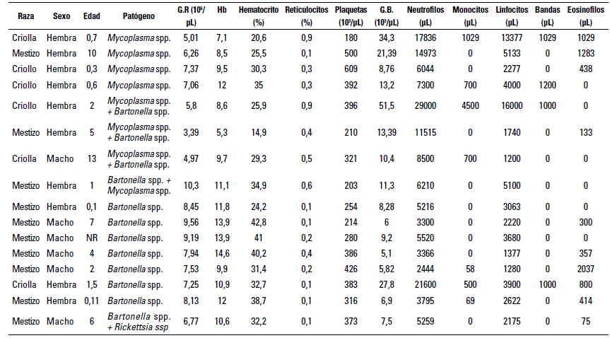 Los datos de los hemogramas de quince felinos infectados con uno o más agentes hemotrópicos se muestran en la tabla 2. Once de ellos fueron positivos por un solo agente infeccioso, cuatro en coinfección con Mycoplasma spp. y Bartonella spp. y un felino con Rickettsia spp. y Bartonella spp. De los individuos positivos, once de ellos tenían hemogramas sin alteraciones de los rangos de referencia, aunque tres de ellos presentaban coinfecciones con otro agente. Dos de los felinos positivos, uno para Mycoplasma spp. y otro para Mycoplasma spp. y Bartonella spp., tenían anemia moderada (hematocrito 20,6%) y severa (hematocrito 14,9%) y reticulocitos de 0,9% y 0,4%, respectivamente. Solo un individuo positivo para Mycoplasma spp. presentaba trombocitopenia (plaquetas 180.000), tres tenían plaquetas en limites inferiores (<250.000 plaquetas).