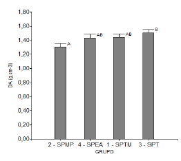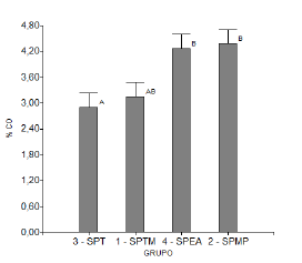 En relación con los grupos 1 y 3, no se encontró diferencia estadística significativa (p> 0,050). Por el contrario, el análisis estadístico permitió evidenciar diferencias significativas (p< 0,010) entre los grupos 2 y 3. También se detectaron diferencias entre los grupos 3 y 4. En esta investigación no se encontraron diferencias estadísticas significativas (p > 0,050) entre los grupos 1, 2 y 4 (figura 1).