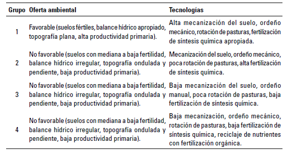 Grupo 1: Sistemas de Producción con Tecnología Moderna (SPTM); Grupo 2: Sistemas de Producción de Mediana Productividad (SPMP); Grupo 3: Sistemas de Producción Tradicionales (SPT); Grupo 4: Sistemas de Producción Ecoamigables (SPEA). Fuente: elaboración propia.