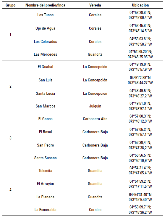 La selección de los predios se basó en la tipificación, previamente realizada, por el proyecto de investigación "Productividad y eficiencia de la energía en diferentes tipos de sistemas de producción lecheros altoandinos de Colombia", financiado por la Universidad del Tolima, para lo cual se determinaron cinco variables: producción de leche (kg/animal), área de pasturas (Ha), unidades animales, topografía (plana, ondulada, ladera) y precipitación (mm/ año) y dos índices (tecnología moderna y tecnología ecoamigable) que permitieron seleccionar las fincas acordes con el propósito de dicha investigación. Se aplicó una encuesta estructurada a los productores identificados en la que se recopiló información específica relacionada con el área productiva, las pasturas, el número y tipo de animales, las prácticas de manejo de los suelos, entre otros. Se realizó un análisis de conglomerados obteniendo cuatro (4) tipos representativos según los sistemas de producción. Para cada conglomerado, se identificaron las fincas centrómero. La extracción de las fincas centrómero se llevó a cabo utilizando el algoritmo de clasificación K-means, que realizó los respectivos agrupamientos minimizando la suma de distancias entre cada objeto y el centroide, basado en sus características. Se eligieron diez fincas de cada grupo caracterizado y se analizaron las primeras cuatro fincas más cercanas al centrómero (tabla 1). En la tabla 2 se comparte la localización geográfica de los sistemas analizados.