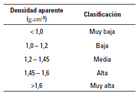 Se aplicó por triplicado la técnica de terrón parafinado, descrita por el IGAC (2006), para calcular la densidad aparente (DA) de los suelos objeto de estudio, expresada en gramos sobre centímetro cúbico (g.cm-3). Los valores obtenidos se compararon con la tabla de clasificación de densidad aparente en suelos (tabla 4) desarrollada por Cairo (1995) y citada por Castillo (2005).