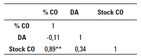 % CO: porcentaje de carbono orgánico; DA: densidad aparente (g.cm-3); Stock CO: stock de carbono orgánico en suelo (tC/ha); **: valores altamente significativos (p < 0,010). Fuente: elaboración propia.