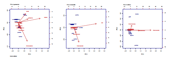 Oxytetracycline is available for different species, except for ornamental birds, turtles, and ferrets. In the case of cattle, these represent the species with the largest amount of data (146), followed by pigs (132), goats (89), and poultry (77). Regarding the routes of administration, industries related to cattle, pigs, and goats have shown intramuscular use in higher degree (81, 70, and 52 registrations, respectively). On the contrary, in poultry industry the oral route predominates (32) for the administration of this molecule. In relation to the use of oxytetracycline PCA showed two components. The first details the use mainly oral in pigs, followed by subcutaneous and intramuscular routes. Concerning horses and ruminants, its use is detailed mainly by the intramuscular route (figure 1).