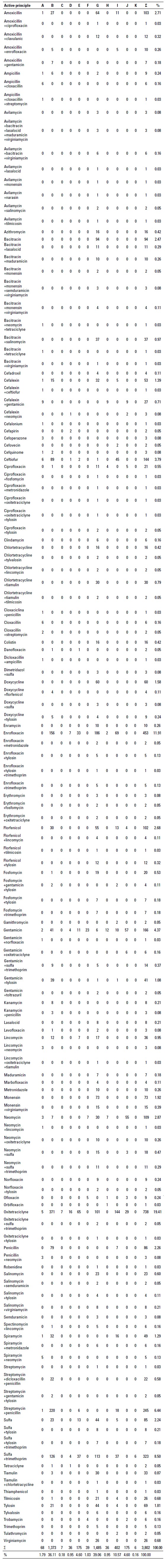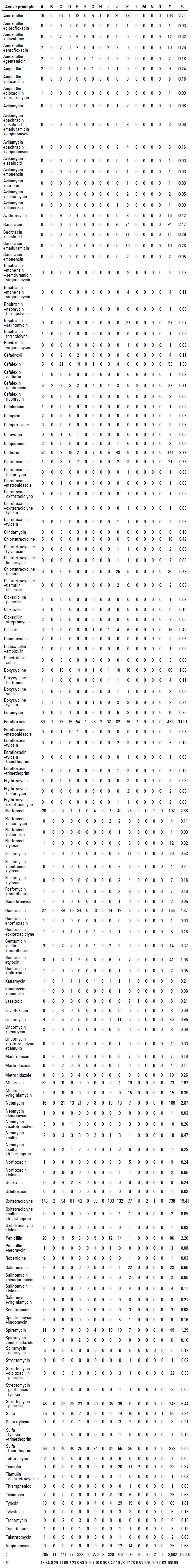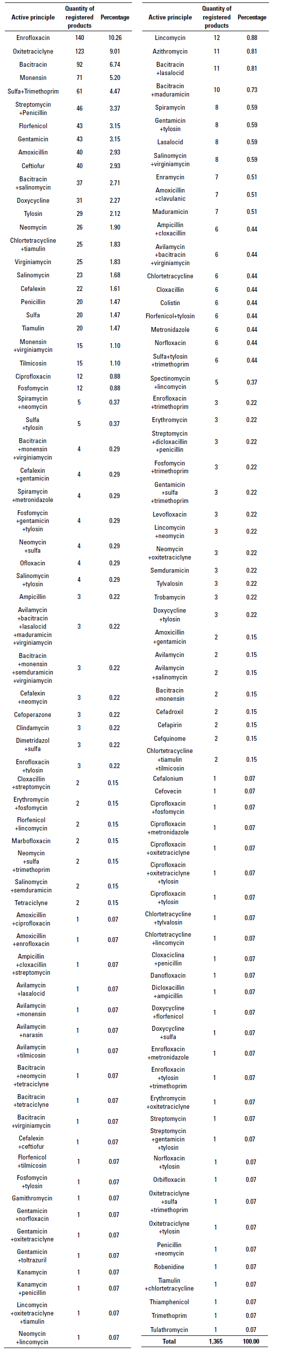 At the time of this study, 141 registered antibiotic molecules or their combinations were found (table 2). The ten molecules with the highest number of registrations are enrofloxacin with 140 (10.26%), followed by oxytetracycline with 123 (9.01%), bacitracin with 92 (6.74%), monensin with 71 (5.20%), sulfa in combination with trimethoprim 61 (4.47%), streptomycin in combination with penicillin 46 (3.37%), florfenicol 43 (3.15%), gentamicin 43 (3.15%), amoxicillin 40 (2.93%) and ceftiofur with 40 registrations (2.93%).
