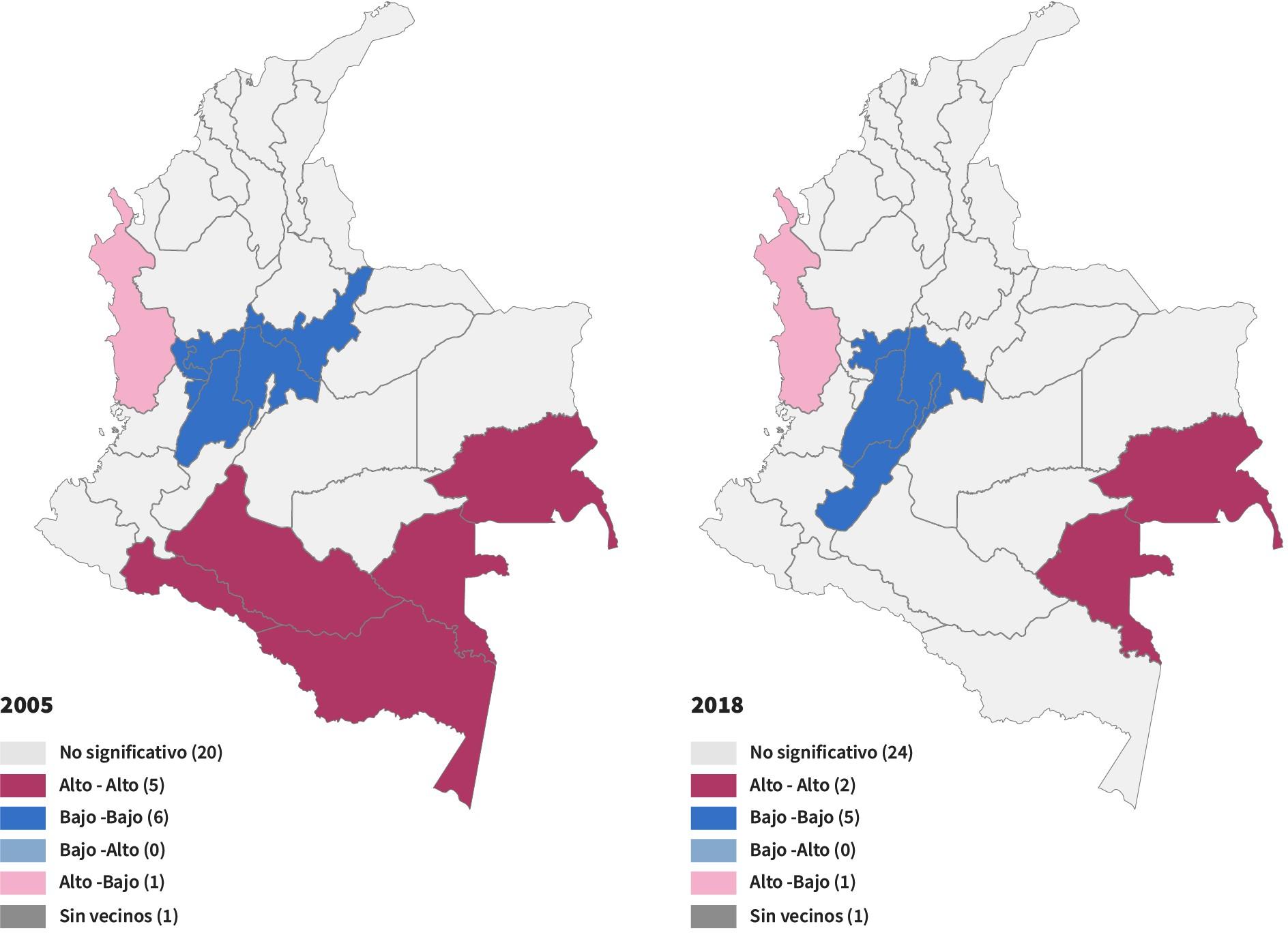 En cuanto al sur del país, aunque no se observaron cambios significativos en los mapas de autocorrelación espacial, la Figura 4 revela que la mayoría de los departamentos pasaron de Alto-Alto a Alto-Bajo. Esto indica una mejora relativa en comparación con sus vecinos, aunque, a excepción de Guainía y Vaupés, estos cambios no fueron lo suficientemente significativos como para ser considerados relevantes.