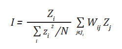 En esta fórmula, xi representa el valor de la variable en la población i, x es la media muestral, wij son las ponderaciones en la matriz de contigüidad W[1] y N es el número de observaciones de la variable. En términos generales, el índice de Moran sigue una distribución normal estandarizada, de modo que un valor significativo positivo (o negativo) del índice Z (o I) implica el rechazo de la hipótesis nula, que en este caso es la ausencia de autocorrelación espacial en los datos (Moreno y Vayá, 2000).