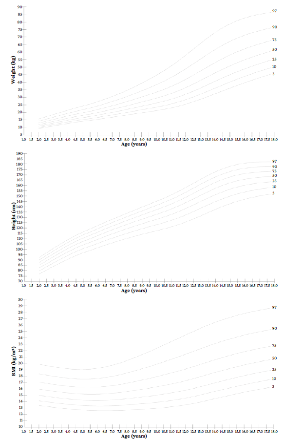 Weight-for-age, height-for-age and BMI-for-age percentiles provide essential information to infer the nutritional and health status of children and adolescents.3-5The real value of growth curves for weight, height and BMI is that they help determine the degree to which the physiological needs of children and adolescents are being met during their growth and motor development process,6 that is, anthropometric measurement is an early method and a suitable data source for assessing growth in this population.7,8