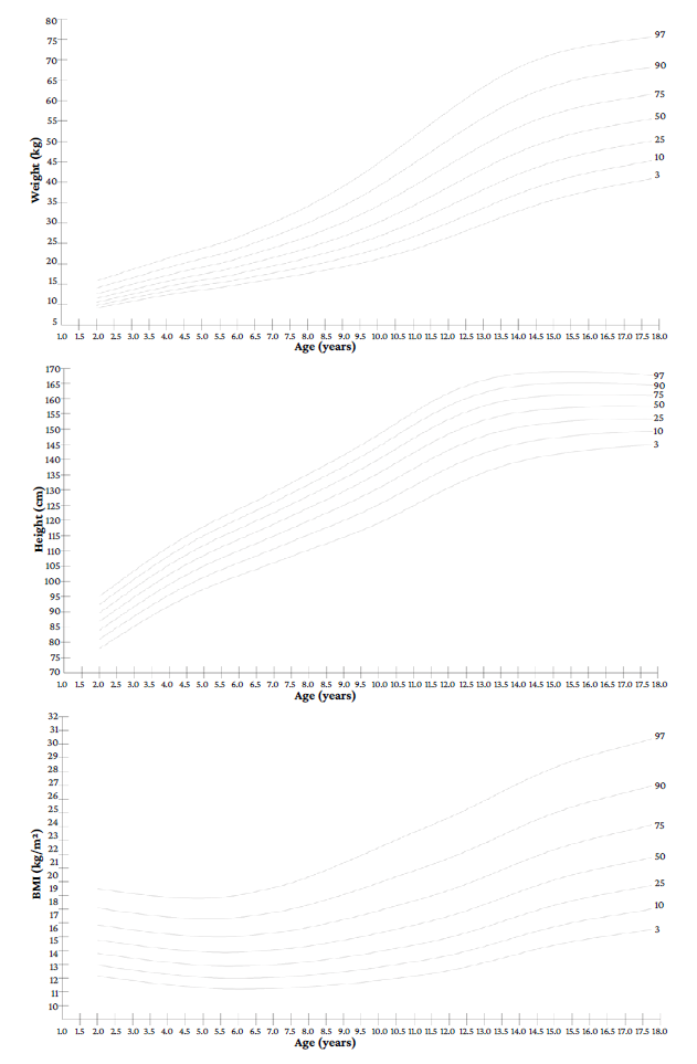 According to the 50th percentile, the greatest increase of weight, height and BMI occurred in males between 13 and 14 years (5.09kg), 2 and 3 years (8.90cm), and 13 and 14 years (0.66kg/m2), respectively. In females, the greatest increase occurred between 12 and 13 years (4.54kg), 2 and 3 years (7.36cm), and 13 and 14 years (0.94kg/m2). Furthermore, at 18 years, weight, height, and BMI were 61.01kg, 168.58cm and 20.65kg/m2 and 55.76kg, 157.64cm and 21.88kg/m2 in males and females, respectively.