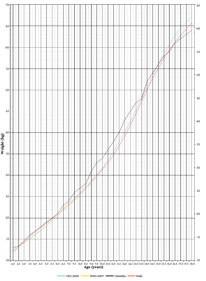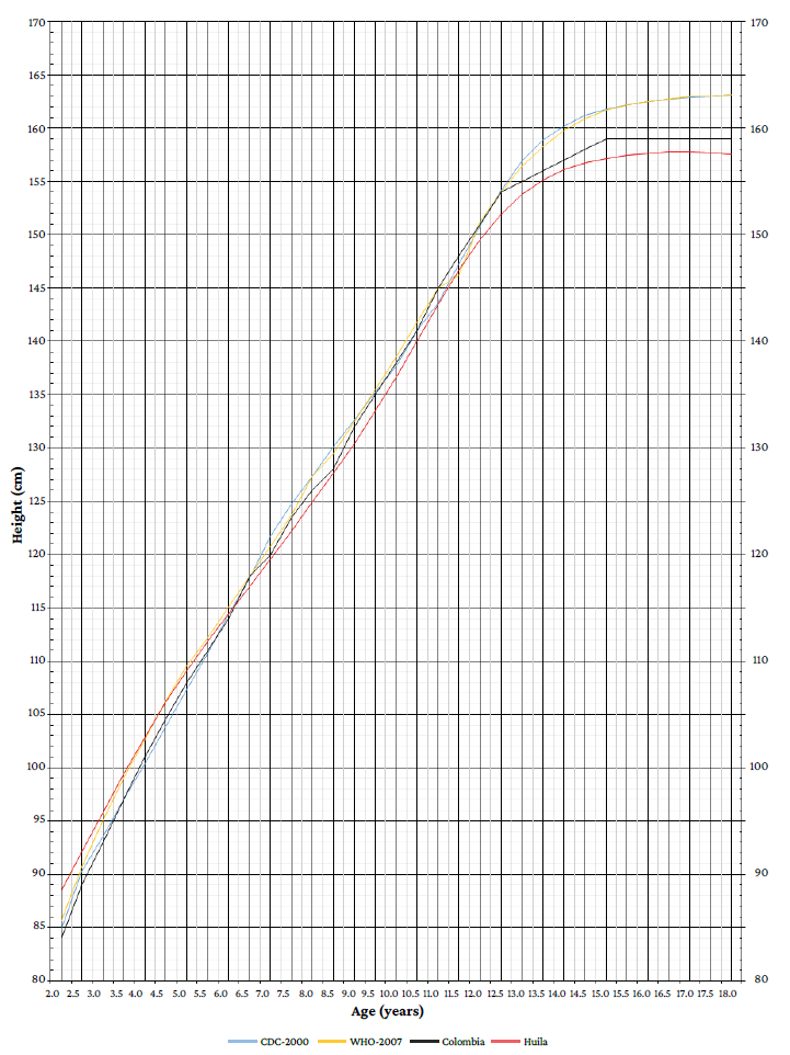 The reference weight-for-age and height-for-age growth values in the pediatric population of Huila are lower than the reference values described by the Centers for Disease Control and Prevention and the World Health Organization, as well as those reported in European countries and in Colombia (the latter with the exception of height at 5 years and weight at 18 years in females).