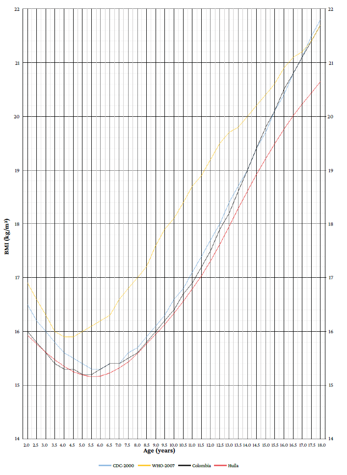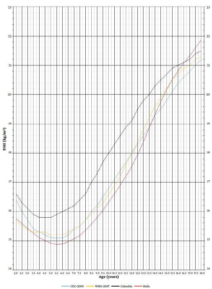 The growth standard published by the WHO,40 which includes international reference values for BMI-for-age, height-for-age and weight-for-age for the population between 5 and 19 years of age, was officially adopted in Colombia by means of Resolution 2121 of 2010. 41 Consequently, the values established in this study for children and adolescents in Huila, Colombia are compared with the values reported internationally.