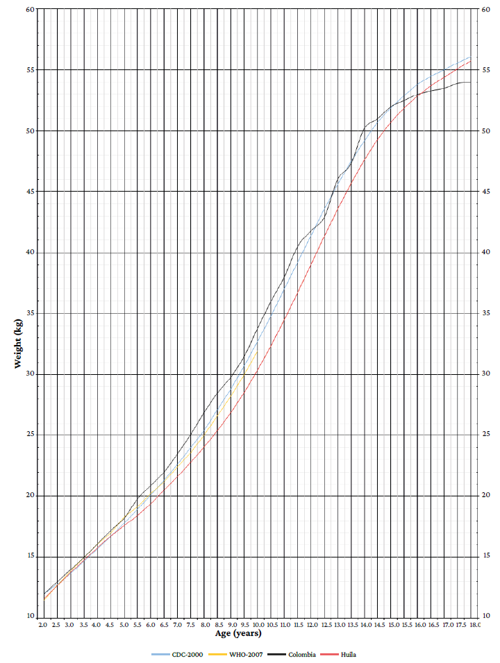 Finally, weight-for-age and height-for-age reference values of children and adolescents in Huila (Colombia) are below the international reference values established by the CDC and the WHO, as well as the reference values described by growth studies developed in European countries and in Colombia (except for height at 5 years and weight at 18 years in females, where values were similar and higher, respectively).