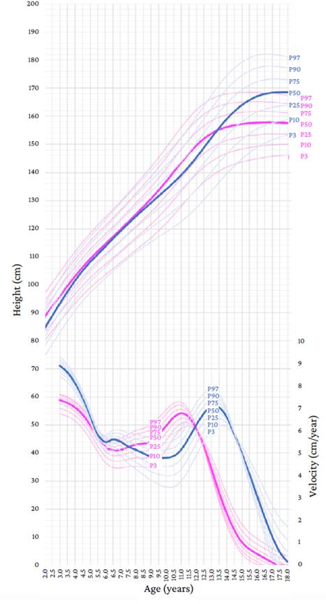 The height growth curve shows that, in the 50th percentile, the height of girls increased before that of boys (Figure 5). Likewise, it can be observed that girls entered the growth spurt earlier and have a higher height growth rate than boys in the same period, with their height being higher than that of boys from the age of 8.5 years (first point of intersection). However, as boys began to enter the growth spurt, the height growth rate accelerated, with boys' height surpassing that of girls at age 13.5 years (APHV), creating the second point of intersection. From this age on, the gap between the height of boys and girls continued to widen until the age of 18 (168.6cm and 157.5cm).