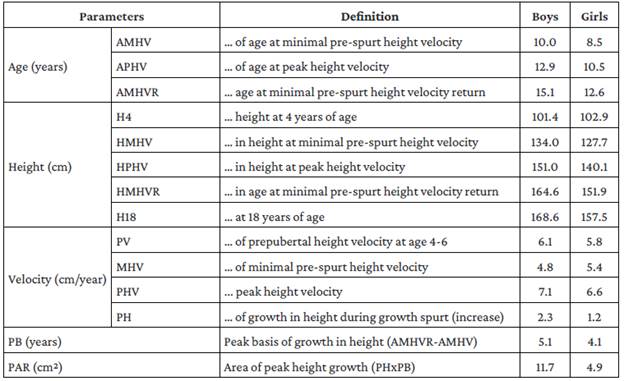 The present study found that in boys: (i) HV begins at 10 years of age (AMHV) and ends at 15.1 years of age (AMHVR), (ii) APHV occurs at 12.9 years of age (PHV=7.1cm/year), and (iii) the last increase in height occurs at 17.5 years of age. In turn, in girls, it was found that: (i) HV begins at 8.5 years of age (AMHV) and ends at 12.6 years of age (AMHVR), (ii) APHV occurs at 10.5 years of age (PHV=6.6cm/year), and (iii) the last increase in height occurs at 16.9 years of age. Thus, it should be noted that: (i) AMHV, APHV and AMHVR in girls occur 1.5, 2.4 and 2.5 years earlier than in boys, respectively, and (ii) PHV in boys is longer (PB: +0.9 years) and more intense (PAR: +1.1 cm/year) than in girls.