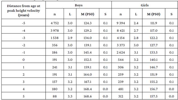 Table 3: Reference values for height (cm) of children and adolescents in Huila, Colombia, according to the distance from age at peak height velocity.