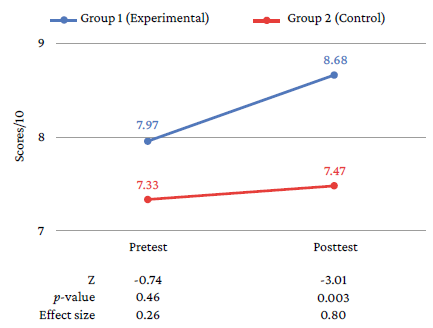 The difference in the mean score of the pretest knowledge test between the experimental group (7.97/10) and the control group (7.33/10) was not statically significant (p=0.46). After using the resource, the mean score on the posttest knowledge test of the experimental group (8.68/10) increased in greater proportion compared to the control group (7.47/10), the difference between the two groups became statically significant (p=0.003), and the ES was high (0.80), as seen in Figure 2.