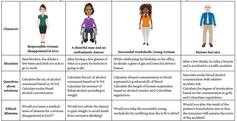 Solutions with empathy is an interactive learning resource that simulates the daily situations experienced by four characters related to alcohol consumption (liquid solutions) and its impact on the body (available at https://view.genial.ly/5f2e106620c4eb0d81b13a31). Its name refers to the course's disciplinary content (homogeneous mixtures or solutions) as well as the fact that medical students must learn to solve moral dilemmas during consultations by not only calculating solution concentrations but also acting empathetically. Empathy is a fundamental aspect of the patient-physician relationship and is necessary to deliver the appropriate care that the patient requires.21