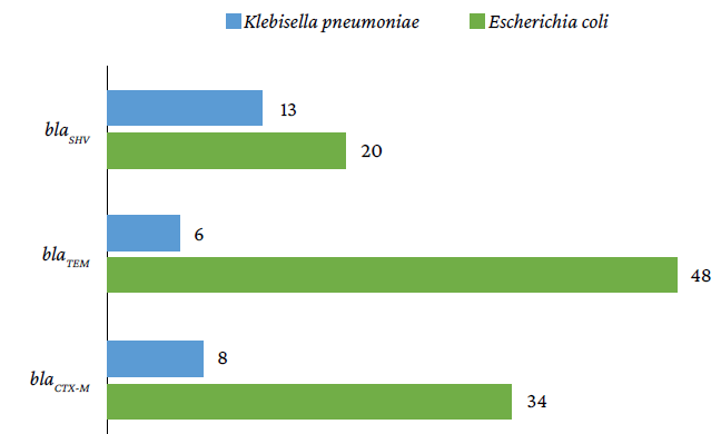 All the bacteria isolated in the 3 hospitals were multi-drug resistant (105 E. coli and 13 K. pneumoniae). Coexistence of ESBL genes (blarEM, blacrx-M, blasHv) was observed in 32.20% of the isolates (28.57% of E. coli and 61.53% of K. pneumoniae isolates). Coexistence of 2 and 3 genes was found in 12.71 % and 21.18 % of isolates, respectively. In addition, blarEM was the ESBL gene most frequently expressed in the isolates (45.76%).