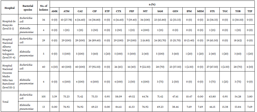 118 isolates of E. coli and K. pneumoniae obtained from urine samples of patients with UTI processed between April and August 2019 in the laboratories of the microbiology area of 2 hospitals operated by the Social Security (ESSALUD) and one by the Ministry of Health (MINSA) of Peru were analyzed: 40 isolates from the Hospital de Huaycán (level of care II-1), located in the province of Lima; 44 from the Hospital Nacional Docente Madre Niño San Bartolomé (level of care III-1), located in the province of Lima; and 34 from the Hospital Nacional Alberto Sabogal Sologuren (level of care IV-4), located in the province of Callao.