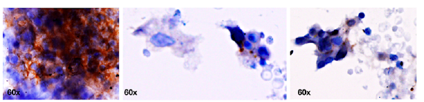 Figure 1: Infection of gastric cancer tumor cells by rotavirus Wt1-5 in primary cell culture (model 1). Note: disaggregated diffuse gastric adenocarcinoma cells were infected with rotavirus Wt1-5 (MOI 0.8) and the images represent horseradish peroxidase immunochemical staining of rotavirus structural antigens at 12 hours post infection.