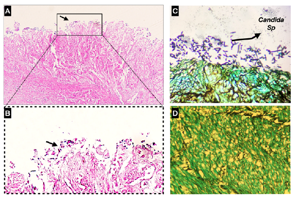 Figure 3: A) Immunohistochemical test of the primary culture of diffuse gastric adenocarcinoma with hematoxylin and eosin staining x10; B) Immunohistochemical test of the primary culture of diffuse gastric adenocarcinoma with hematoxylin and eosin staining x60; C) and D) Presence of yeasts and pseudohyphae on the mucosal surface of the tumor according to immunohistochemical test with Gomori-Grocott staining.