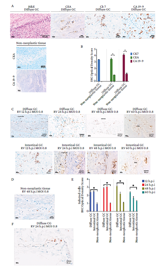 Figure 4: Ex vivo infection of tissue explants of diffuse and intestinal gastric adenocarcinomas with rotavirus Wt1-5 (MOI 0.8). A) Hematoxylin and eosin staining and immunohistochemical staining (CEA, CK-7, and CA 19-9); B) Immunohistochemical optical density score in tumor tissue and non-tumor tissue (data are shown as mean percentages ± standard deviation from three experiments performed on independent samples and repeated twice; Mann-Whitney U test with a p-value<0.05); C) Horseradish peroxidase immunochemical staining of rotavirus structural antigens at 12, 24, 48 and 60 h.p.i. in diffuse and intestinal gastric adenocarcinoma explants; D) Horseradish peroxidase immunochemical staining of rotavirus structural antigens at 48 h.p.i. in non-tumor tissue; E) Quantification of infection determined based on immunohistochemical optical density score as the number of cells positive for rotavirus structural antigens (data are shown as mean percentages ± standard deviation of three experiments performed on independent samples and repeated twice; Mann-Whitney U-test with a p-value<0.05); F) Immunohistochemical staining for rotaviral antigens in gastric adenocarcinoma (24 h.p.i, MOI 0.8), showing a strong cytoplasmic signal in immune cells in the lumen of a blood vessel.
