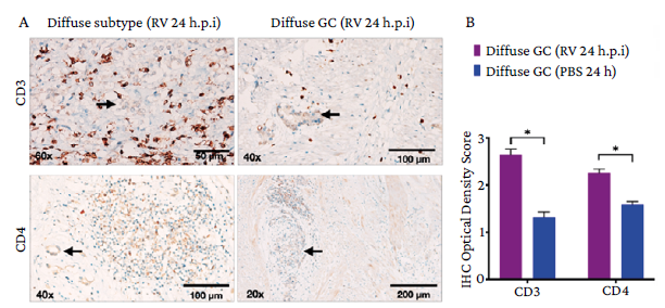 Figure 5: Immune microenvironment in gastric adenocarcinoma after infection with rotavirus Wt1-5. A) CD3+ and CD4+ lymphocyte infiltration in the peritumoral area of diffuse gastric adenocarcinoma after infection with rotavirus Wt1-5 (24 h.p.i, MOI 0.8); tissues inoculated with saline phosphate buffer are shown as a control; the black arrows show tumor cell aggregates; B) Quantification of CD3 and CD4 immune cells with positive immunostaining in tumor; calculation made according to the immunohistochemical optical density score (data are presented as mean percentages ± standard deviation of three experiments performed on independent samples and repeated twice; Mann-Whitney U test with a significance level set at p*<0.05).