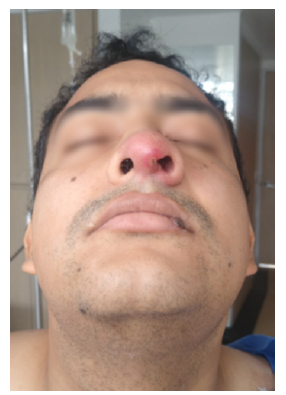 Figure 1: Ulcerative plaque on nasal tip and left labial commissure.