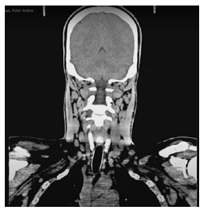 Figure 2: Computed axial tomography of the neck, coronal plane in soft tissue window with multiple cervical lymphadenopathies.
