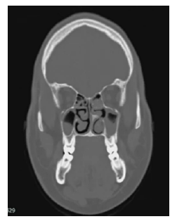 Figure 3: Computed axial tomography of paranasal sinuses, coronal plane in bony window, showing bilateral invasion by soft tissue material in bilateral maxillary and ethmoidal paranasal sinuses.