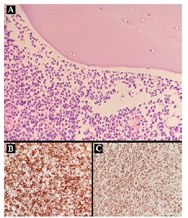 Figure 4: A) B) H&E stain of bone marrow 40X; B) CD34 immunohistochemistry; C) CD20 immunohistochemistry.