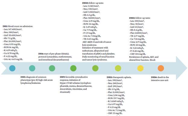 On the tenth DH, follow-up tests were performed, which revealed elevated azotemia compatible with AKIN-II acute renal failure (ARF), hyperkalemia, hyperphosphatemia, hyperuricemia, hypocalcemia, neutropenia, anemia, and thrombocytopenia that required transfusion support. Furthermore, due to the risk of tumor lysis syndrome, treatment with rasburicase (0.2mg/kg/day for 3 days) and allopurinol (300mg orally every 24 hours indefinitely) was started that day, and daily monitoring of the patient's clinical progression was initiated by means of blood chemistry studies (Figure 5).
