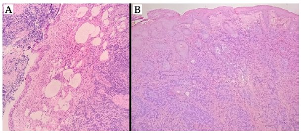Figure 6: A) Infiltration of leukemic cells in sinus mucosa 10X; B) Infiltration of leukemic cells in skin H&E 4X.