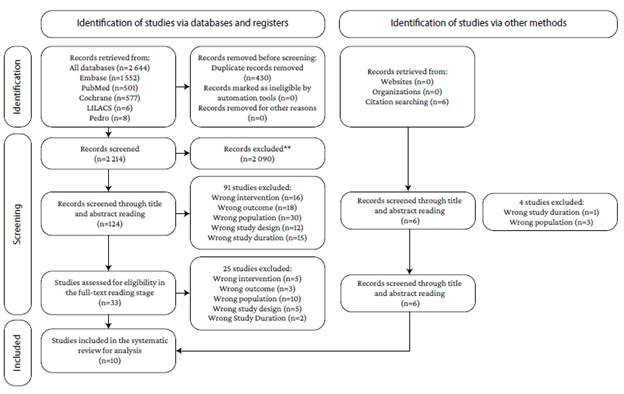 The initial searches yielded 2 650 articles (577 in Cochrane, 1 552 in Embase, 501 in Pubmed, 6 in Lilacs, and 8 in PEDro). These searches, as well as their results, were imported into the Rayyan software. Once duplicates (n=430) were removed, 2 090 articles were discarded in the title screening stage since they did not meet the inclusion criteria; 91 of the remaining 129 were discarded for the same reason in the abstract screening stage. Then, after performing a full-text reading of the remaining 33 studies, 25 were excluded. In addition, a snowball search was conducted in the 8 RCTs that met the inclusion criteria, and 2 more eligible studies were identified and included for final analysis. Therefore, 10 RCTs16-25 were included in this systematic review and meta-analysis. The study selection process is shown in Figure 1.