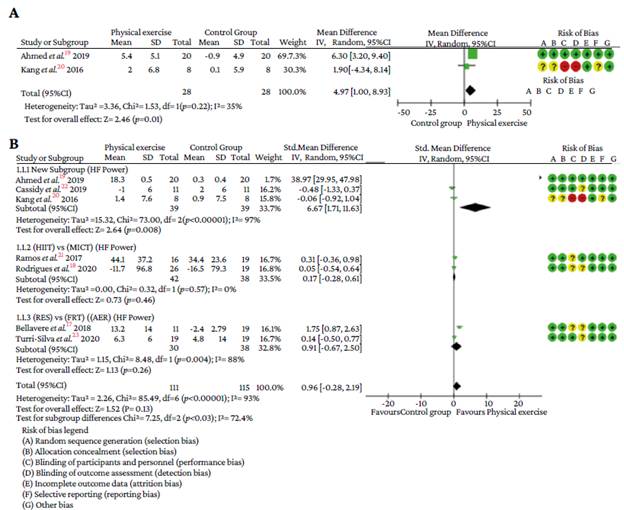 Figures 5: A) Summary of the meta-analysis on the pooled effect of HIIT and MICT versus control group. B) Summary of the meta-analysis on the pooled effect of HIIT versus MICT on LF in individuals with overweight and obesity.