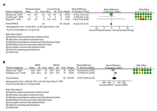 The pooled effect on LF was reported in 3 studies19,20,22 that assessed changes in this HRV parameter after the intervention with HIIT or MICT compared with the control group. In this subgroup, heterogeneity was low (P=0%; p=0.58), and there were no significant differences between groups in the random effects model (WMD=-0.32, 95%CI: -0.73 to 0.10; p=0.13). The effects of HIIT and MICT on LF were compared in 2 studies. 18,21 In this subgroup, heterogeneity was high (P=78%; p=0.03) and, according to the results of the random effects model, there were no statistically significant changes in favor of either model. It seems that both HIIT and MICT show the same results in terms of changes in LF (WMD=10.72, 95%CI:-39.89 to 61.34; p=0.68) (Figure 5).
