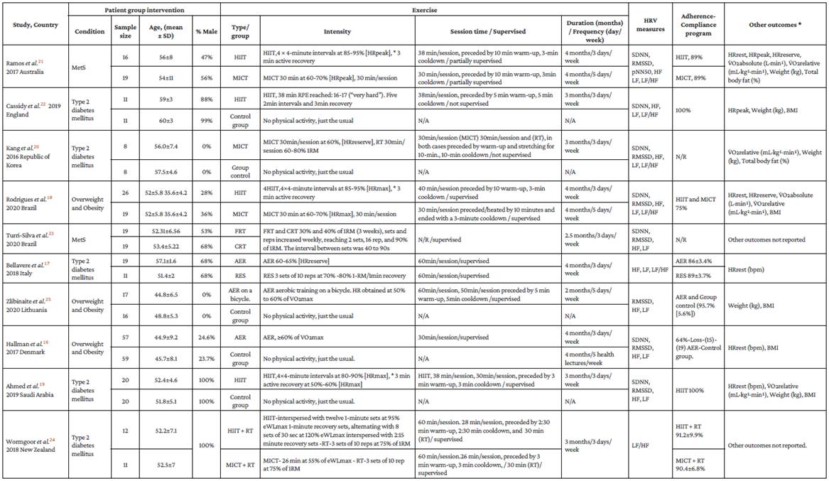 As shown in Table 1, the included RCTs were conducted in different countries (Australia, Brazil, Denmark, England, Italy, Lithuania, New Zealand, Republic of South Korea, and Saudi Arabia), and all 10 reported HRV parameters in patients with overweight and obesity, 16,18,25 type 2 diabetes mellitus,17,19,20,22,24 and metabolic syndrome21,23 as primary outcomes. In total, there were 398 participants, 205 were assigned to the HIIT, MICT, or DST intervention group and 193 to the control group. The mean age in the intervention group was 52.72 years, and in the control group, 52.27. All interventions lasted between 8 and 16 weeks: 12-week interventions in 5 studies, 19,20,22-24 1 6-week interventions in 4 RCTs, 16-18,21 and 8-week intervention in one study. 25