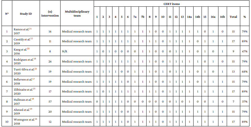 The assessment of the reporting of the interventions was carried out using the CERT checklist. The average score of the RCTs was 14 (73.68% compliance), and all described the FITT of the intervention and the means used for its execution. The full report is shown in Table 2.