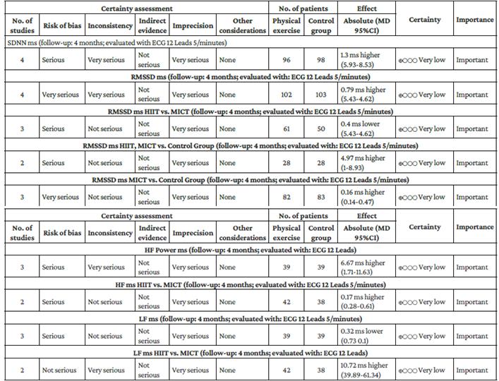 The Cochran's Q test and the I2 test were applied since the primary outcomes were continuous variables. The standardized mean difference ± (SD), with its corresponding 95% confidence interval (CI), was considered as the effect size, and a p<0.05 was established as the significance level. The change in the measurement of HRV time and frequency parameters was assessed, and forest plots were used to detect and quantify heterogeneity among studies. Heterogeneity was considered to be low and moderate if P values <25% and between 25-50% were obtained, respectively, while high heterogeneity was established in the case of p<0.05 or I2 50% values. All statistical analyses were performed using RevMan 5.3 software (Cochrane Collaboration). A random effects meta-analysis was carried out to calculate pooled effects for each outcome variable. Subgroup analyses were then performed comparing differences: HIIT and MICT versus the control group in HF, LF, RMSSD, and SDNN; HIIT versus MICT in HF, LF, and RMSSD, and DST versus MICT and functional strength training (FRT) in HF and LF.