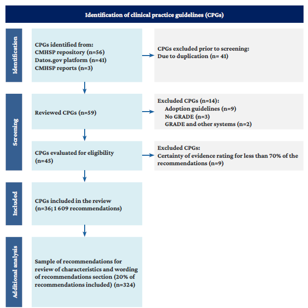 It should also be mentioned that the CMHSP CPG website was suspended during the course of this study and some of the documents that were available there were versions that had been published prior to the issuance of their ISBN. As of July 2023, the documents are available on the Internet, but not uploaded to a repository, limiting access to their contents by physicians and health institutions that use them as a strategy for implementing and disseminating evidence-based medicine. 61