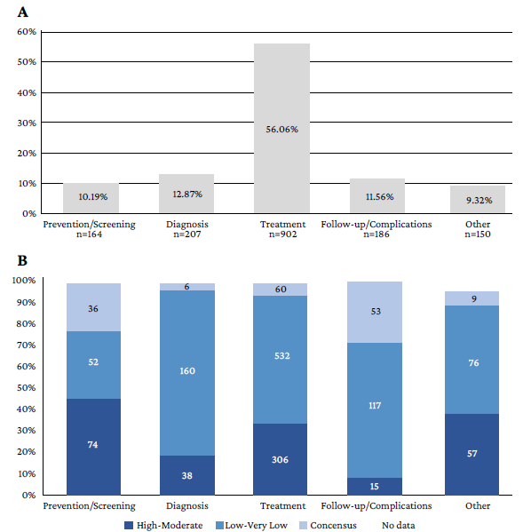 Regarding the analysis of the 1 609 recommendations contained in these 36 CPGs, the following were the main findings: there was a wide variation among the number of recommendations per CPG, both by year of publication (median recommendations per CPG between 32 to 50.5) and by topic group (median recommendations per CPG between 28.5 and 71.5); treatment was the most commonly addressed stage of the care process (>50% of recommendations); and the majority were in favor (>80%) and rated as strong (>60%).