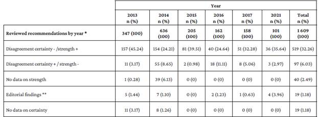 Furthermore, the most frequent finding in the review of general characteristics of the 1 609 recommendations was disagreement between the certainty of the evidence and the strength of the recommendation (38.28%), especially strong recommendations based on evidence with low or very low certainty (32.26%). However, it should be noted that, compared to the recommendations included in CPGs published in 2013, a decrease in the frequency of this disagreement was observed in those included in CPGs published in 2021 (45.24% vs. 35.64%). Similarly, in the analysis by year of publication, it was observed that from 2015 onwards, information on the strength of the recommendation and the certainty of the evidence was included in all recommendations (Table 5).