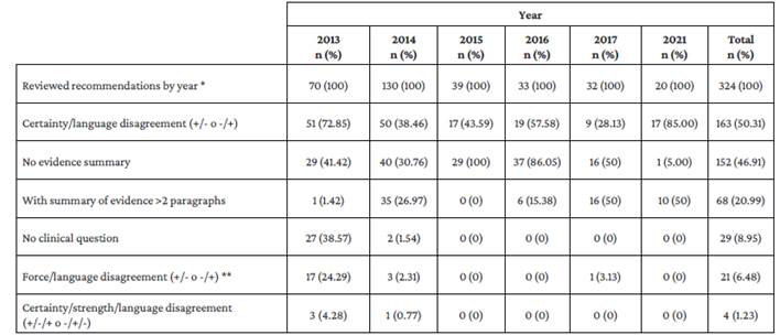 Regarding the review of the wording elements of the recommendations (n=324), the most common finding was the disagreement between certainty of evidence and language (50.31%), mainly the use of terms such as "should" or "recommended" in recommendations based on evidence with low or very low certainty (n=120, 73.62%). In addition, it is worth mentioning that the proportion of strength/language mismatches (+/-or -/+) and the frequency of certainty/strength/language mismatches (+/-/+ o -/+/-) decreased considerably in the recommendations included in CPGs published in the most recent years.