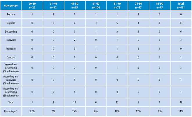 43 (11%) polyps were smaller than 1cm; 16 (4%) were between 1cm and 2cm long; no polyps larger than 2cm were found, and the remaining results did not show any abnormality. Polyps were found in all segments of the colon in the 41-50 age group, but the highest percentage (11%) was observed in the 71-80 age group. 68.7% ofpolyps larger than 1cm and 67% smaller than 1cm were found in the left colon.